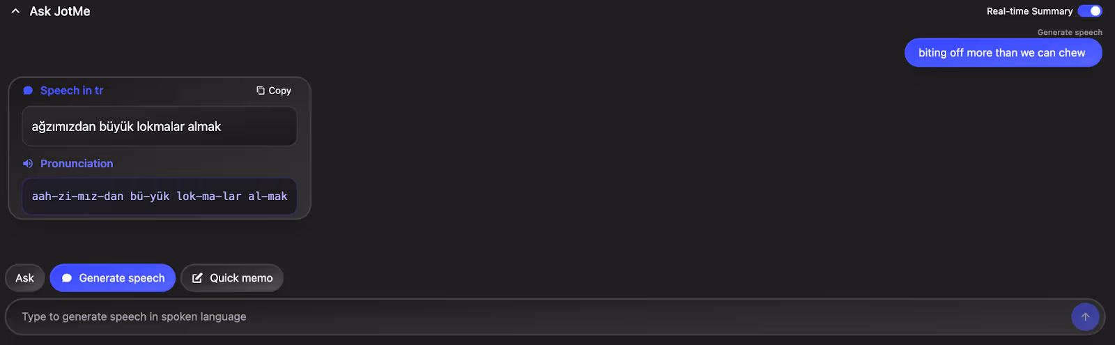 For example, during our last week’s meeting, someone said, “If we keep expanding the scope, we might end up biting off more than we can chew.” JotMe understood the context of the idiom and translated it to “Daha fazla özellik eklemek yerine netlige odaklanalim (Let's focus on clarity instead of adding more features).”
