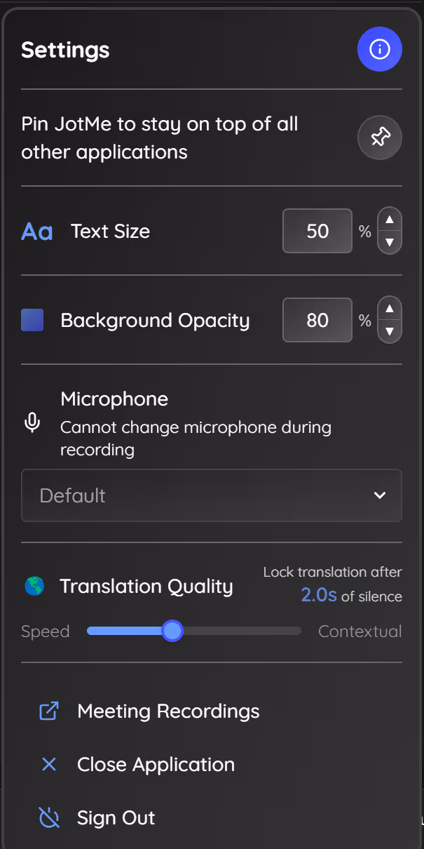 Để sử dụng JotMe để dịch giọng nói sang văn bản trực tiếp, chỉ cần tải xuống và cài đặt nó trên thiết bị di động hoặc máy tính để bàn của bạn. Tiếp theo, đặt ngôn ngữ nói và ngôn ngữ dịch để bắt đầu dịch trực tiếp. Bạn thậm chí có thể nhận được bản tóm tắt thời gian thực về các cuộc trò chuyện của mình, Tạo giọng nói bằng ngôn ngữ của người nói, sử dụng trình dịch AI để dịch văn bản sang văn bản và hơn thế nữa trong ứng dụng JotMe trên máy tính để bàn.